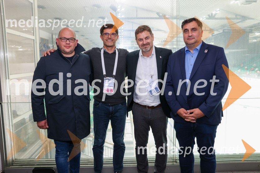 Miha Butara, podpredsednik, Hokejska zveza Slovenije; predsednik, HDD Olimpija; pomočnik direktorja, Slovenske železnice; Matjaž Rakovec, predsednik Hokejske zveze Slovenije; Petr Bříza, podpredsednik, IHF, Mednarodna hokejska zveza; mag. Peter Bohinec, predsednik, HDD Sij Acroni Jesenice Slovenija - Madžarska, hokejska tekma, VIP