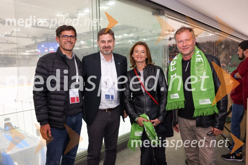 Matjaž Rakovec, predsednik Hokejske zveze Slovenije; Petr Bříza, nekdanji češki hokejist; Tanja Fajon, predsednica stranke SD ; Veit-Ulrich Braun, novinar Slovenija - Madžarska, hokejska tekma, VIP