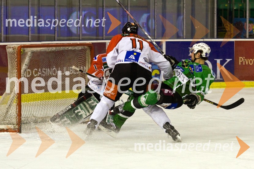 Seamus Kotyk in Philippe Lakos, hokejista Innsbrucka in Brendan Yarema, hokejist Tilie OlimpijeHokej: Liga Ebel, 42. krog: Tilia Olimpija - Innsbruck