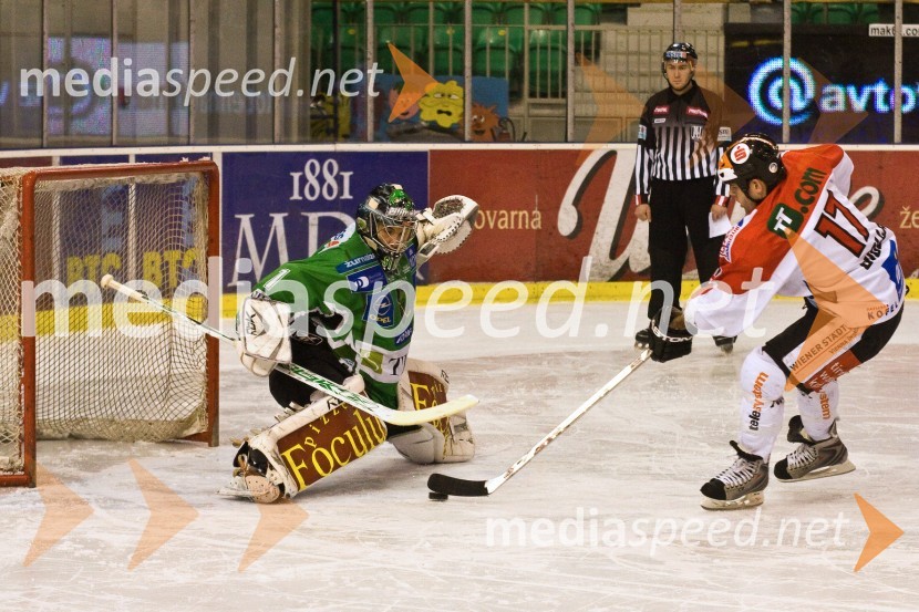 Aleš Sila, vratar Tilie Olimpije in Steve Guolla, hokejist Innsbrucka, strelec tretjega zadetkaHokej: Liga Ebel, 42. krog: Tilia Olimpija - Innsbruck