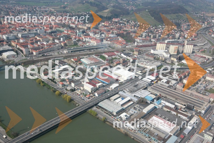 Maribor Melje: Žito Intes d.d., Henkel Slovenija d.o.o., MLM d.d. Mariborska livarna Maribor, Košaki Tovarna mesnih izdelkov d.d., Oreško nabrežje, reka Drava, železniški most, dvoetažni most (fotografirano iz letala Douglas DC-6B) Maribor in okolica iz zraka
