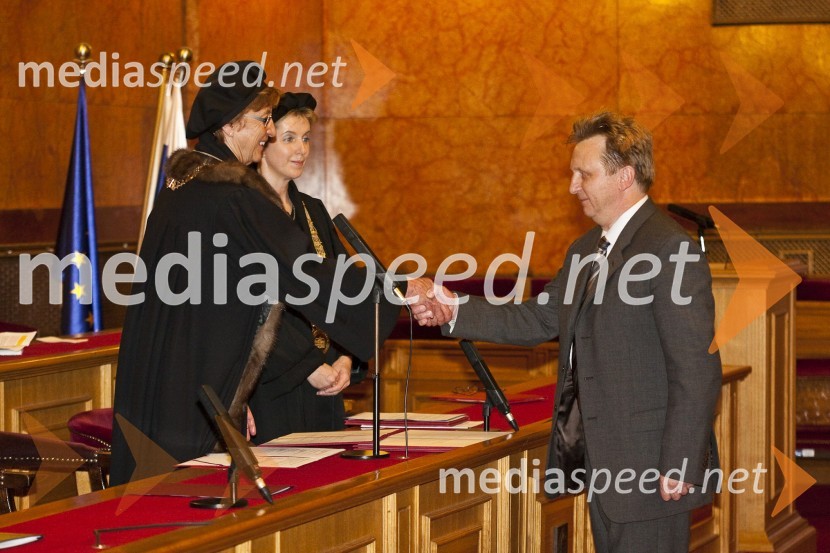 Prof. dr. Andreja Kocijančič, rektorica Univerze v Ljubljani, prof. dr. Barbara Simončič, prodekanica Naravoslovnotehniške fakultete Univerze v Ljubljani in dr. Miloš Markič, Naravoslovnotehniška fakulteta Univerze v Ljubljani Promocija doktorjev znanosti Univerze v Ljubljani, 19. maj 2009