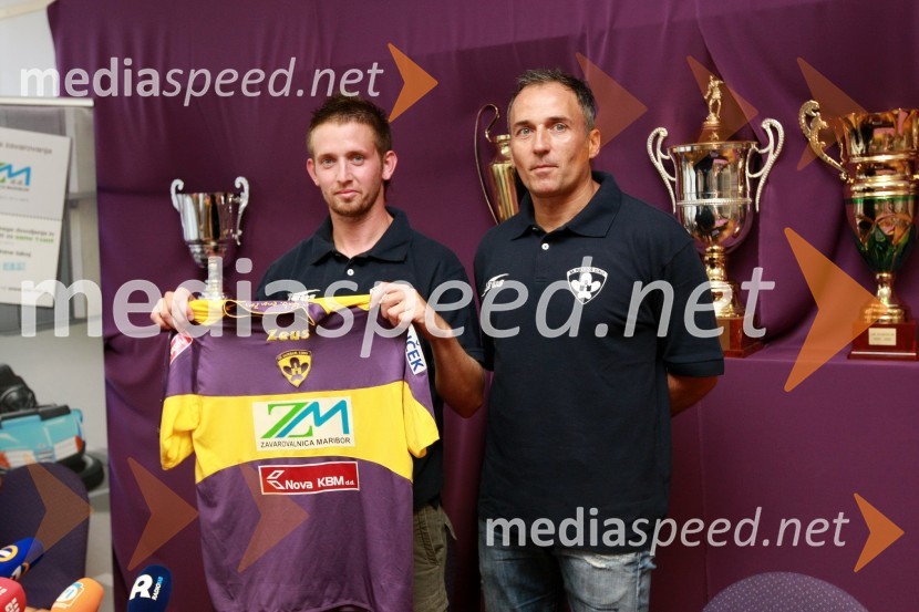 Janez Aljančič, nogometaš NK Maribor in Darko Milanič, trener NK MariborNovinarska konferenca NK Maribor pred povratno tekmo drugega kroga kvalifikacij za ligo prvakov Maribor – WIT in predstavitev tretjega novinca v vijoličastem Janeza Aljančiča