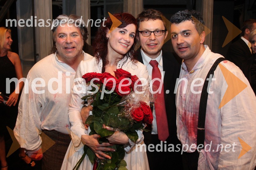 Miro Solman, operni pevec, Elena Kononova, operna pevka, Janko Kastelic, dirigent ter umetniški vodja Opere in baleta SNG Maribor in Mamuka Lomidze, operni pevec Tosca, premiera opere v SNG Maribor