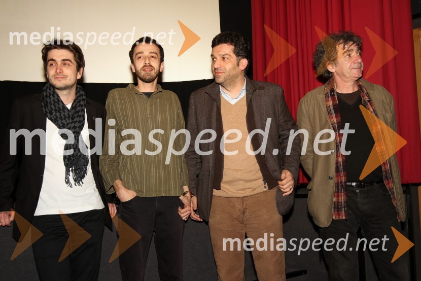Boris Ler, igralec in Almir Mehić, igralec, Danis Tanović, režiser in Miki Manojlović, igralecPremiera filma Cirkus Columbia