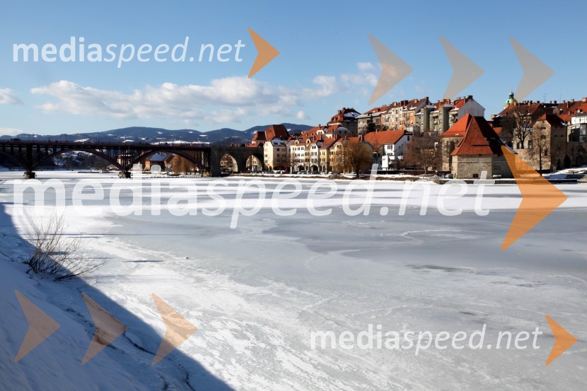 Reka Drava, MariborZasnežena in poledenela reka Drava v Mariboru