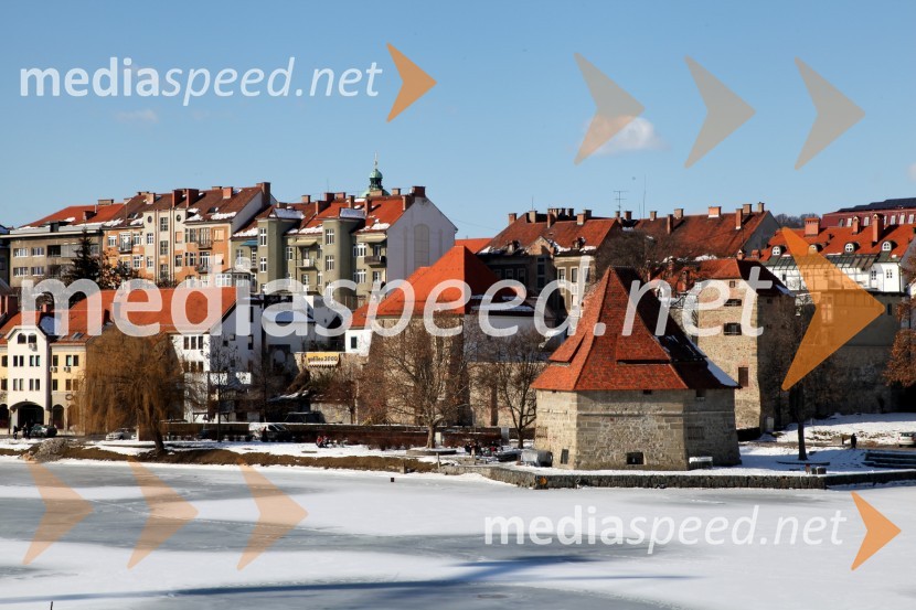 Reka Drava, MariborZasnežena in poledenela reka Drava v Mariboru