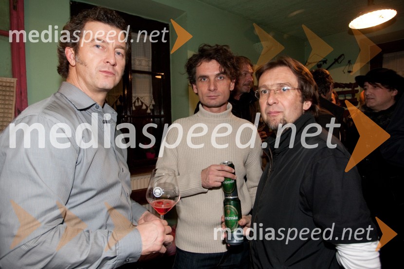 Mark Čuček; Jure Longyka, moderator; Roman Uranjek, slikarPromocija novega albuma Sedam skupine Plavi Orkestar