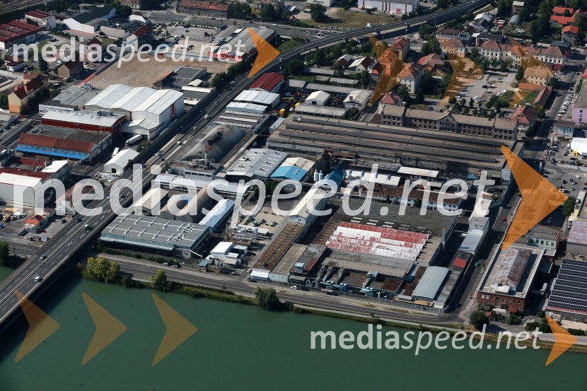 Maribor Melje: Žito Intes d.d., Henkel Slovenija d.o.o., MLM d.d. Mariborska livarna Maribor, Košaki Tovarna mesnih izdelkov d.d., Oreško nabrežje, reka Drava, železniški most, dvoetažni most Maribor in okolica iz zraka