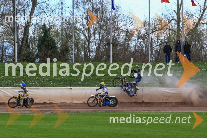 Žal pa mu je padec na dirki državnega prvenstva, ki je bila ta velikonočni ponedeljek v Krškem, vsaj za nekaj časa prekinil profesionalno kariero. Usodna enajsta vožnja je bila, ko je po startu vozil na drugem mestu za Italijanom Michelem Castagno in v borbi za prvo mesto s svojim prednjim kolesom zadel v zadnje kolo vodilnega, čemur je sledil več kot spektakularen padec, ki sta ga uspela ujeti tudi naša dva fotografa. Matica je z motorjem tako dvignilo, lahko rečemo celo katapultiralo, da je dobesedno splezal na ogrado, pri tem ga je še vrglo iz sedeža in ko je že kazalo, da se lahko zgodi, da bo letel čez ogrado, ga je sila le obdržala na dirkalnem ovalu stadiona Matije Gubca v Krškem. Kakih 2000 gledalcev, ki je zadrževalo dih, pa si je lahko kmalu oddahnilo, saj je Matic hitro pokazal, da je pri zavesti. Seveda so ga takoj prepeljali kar v Ljubljanski klinični center, neuradno pa smo izvedeli, da si je zlomil golen in mečnico ter bil že takoj zvečer operiran. Zlom bi naj bil gladek, kot pravijo v žargonu, brez okrušenih delov kosti, kar pomeni, da je imel Matic na koncu resnično še srečo v nesreči, s čimer so se strinjali tudi njegovi najbližji, ki so bili pomirjeni na račun tega, da Matic ni imel nobenih drugih, še težjih poškodb.