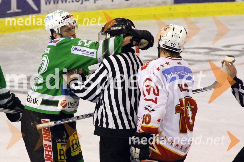 Jeseničani so povedli že po dobri minuti igre, ko je ljubljanskega vratarja Klemna Mohoriča z modre črte presenetil Jurij Goličič, nato pa je, prav tako v prvi tretjini, v 14. minuti, Paul Healey plošček spretno preusmeril v gol po strelu Aleša Kranjca.