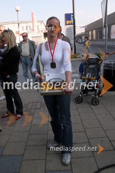 V ljubljanskem malem mestu velikih nakupov BTC, so na Aleji mladih pričakali evropskega prvaka na bradlji Mitja Petkovška. Na slavnostnem sprejemu, ki sta ga vodila Tone Fornezzi Tof in Pia Pustovrh, je spregovoril mestni župan Zoran Janković in predsednik uprave BTC Jože Mermal. Oba gospoda sta prvaku čestitala in z velikim objemom zaželela srečo na Olimpijskih igrah v Pekingu. Sprejema se ni udeležil Aljaž Pegan, ki je na drogu osvojil 3. mesto.V teh dneh se namreč mudi na Kitajskem, kjer si ogleduje velike priprave na dolgopričakovane Olimpijske igre. Njegovo medaljo in nagradi, ki sta jih izročila župan in predsednik uprave BTC je sprejela njegova punca Nina Logar. Za glasbeno vzdušje je pred podelitvjo nagrad in po njej poskrbela skupina Atomik Harmonik.