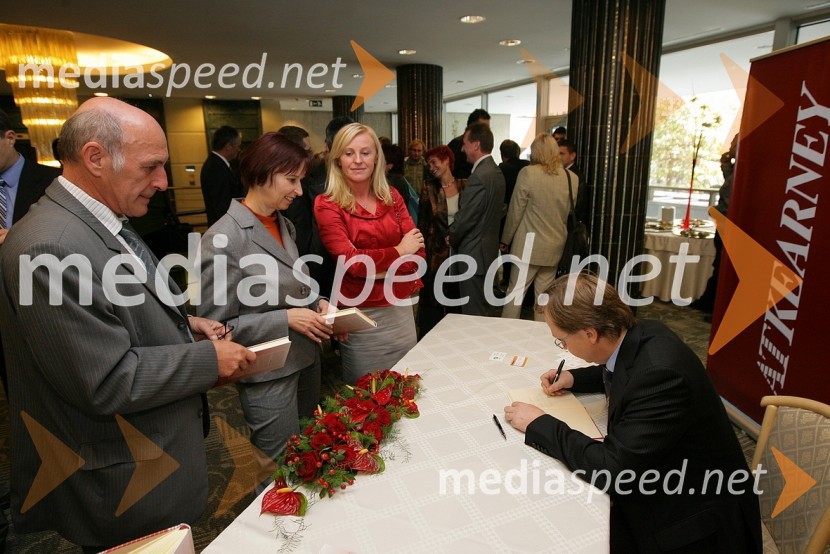 Branko Žibret, partner A.T. Kearney in avtor knjige Strateška nabava med podpisovanjem knjigePredstavitev knjige Branka Žibreta: Strateška nabava in okrogla miza: Kako kupiti ceneje in več znanja