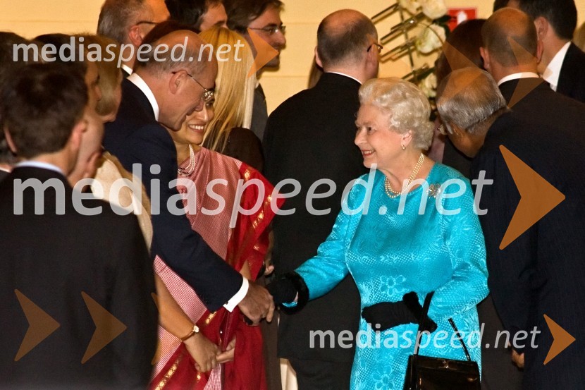 Sprejem kraljice Elizabete II. in vojvode Edinburške v Grand Hotelu Union - Yousif B. Ghafari, ameriški veleposlanik v Sloveniji in kraljica Elizabeta II., rokovanje Obisk kraljice Elizabete II. in vojvode Edinburškega v Sloveniji - prvi dan (prihod in sprejem v Grand Hotelu Union)