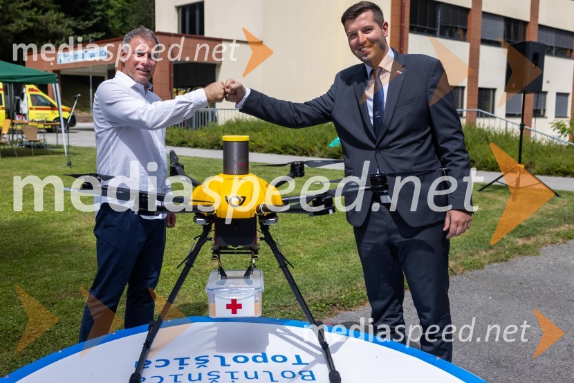 MARIBOR, 13. julij 2021 – Potem ko je Pošta Slovenije v začetku junija izvedla prvi poskusni let z brezpilotnim letalnikom – dronom in v zaključni fazi leta dostavila pošiljko Poštarskemu domu na Vršiču, nadaljuje z začrtanimi aktivnostmi pri razvoju možnosti dostave z brezpilotnimi zrakoplovi v okviru možnosti, ki jih omogoča nova zakonodaja EU. Skupaj s Splošno bolnišnico Topolšica je danes predstavila možnost dostave krvnih vzorcev za potrebe laboratorijske diagnostike, ki pomeni boljšo dostopnost laboratorijske diagnostike širšemu krogu uporabnikov/bolnikov. Pred Bolnišnico Topolšica je bila izvedena zaključna faza leta brezpilotnega letalnika v okviru poskusne dostave krvnih vzorcev iz ZD Nazarje v laboratorij Bolnišnice Topolšica. Poleg direktorja Bolnišnice Topolšica Jurija Šorlija in začasnega generalnega direktorja Pošte Slovenije Tomaža Kokota, sta se dogodka med drugim udeležila tudi državni sekretar na Ministrstvu za infrastrukturo RS Aleš Mihelič ter državni sekretar na Ministrstvu za zdravje RS mag. Franc Vindišar.